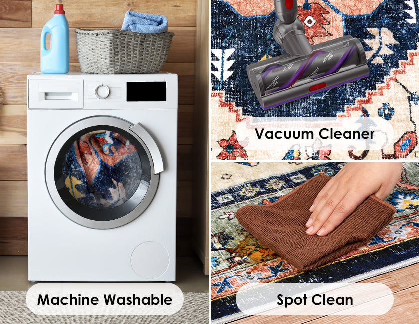 Our washable rugs are made from premium fibers, offering stain and splash resistance. For long-term use, when dust and dirt build-up, you have the option to vacuum or machine wash in a properly sized washing machine